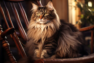 Com um porte físico imponente, os Maine Coons podem pesar entre 6 e 12 kg, e suas fêmeas geralmente são menores do que os machos. Sua pelagem é densa e macia, com uma variedade de cores e padrões, desde sólidos até tabby, tricolor e bicolores. Além disso, possuem uma cauda longa e exuberante, que muitas vezes é comparada a uma plumagem de guaxinim, daí o nome “Coon”.